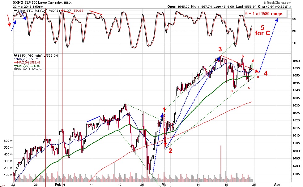 Analyzing the 60min SPX has brought me to a conclusion and a revision of previous counts. With the Patterns progress since the 15th of March, I can now see a triangular pattern that when complete will have an ABCDE formation typical of a 4th wave structure. When wave e has been met we should be looking for a move higher for the final leg. The markets should receive good news or will be credited for the good news in the next few days when markets rise.