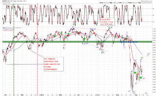 While yesterdays positive divergence was negated, today's positive divergence was not, and we got a subsequent rally out of it. We should look for indicators in the intra-day to show us the way tomorrow. Any OB / OS condition tomorrow will be the dominant factor in my views. If we are indeed starting a Green 3rd wave, it wont be a surprise that waves at this point could be hidden and not fully viewed by the naked eye as it gaps or accelerates down.