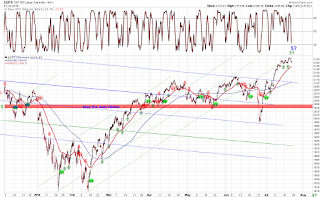 New highs has been established. So here are where the time frames stands.. The weekly start has brought about a new high and also pierced the upper BB line at 2138.29. The monthly however has not touched the upper BB line at 2174.90 which is 30+ pts. away. We may never hit this, but the first clues to this would be if price is able to close the week below the weekly upper BB line as it did today. Not only will it signal a weak sentiment but also a reversal bar. Looking then to lower time-frame to also show its negative sentiment would be ideal. The weekly neg. divergence from the April highs to current is on the verge of disappearing, and if prices remains up with signals exceeding the divergent requirement, we can be assured that the bulls are still carrying on. This is of course what OB conditions look like and should be studied by the people who visit this blog and also to understand what this blog is all about.